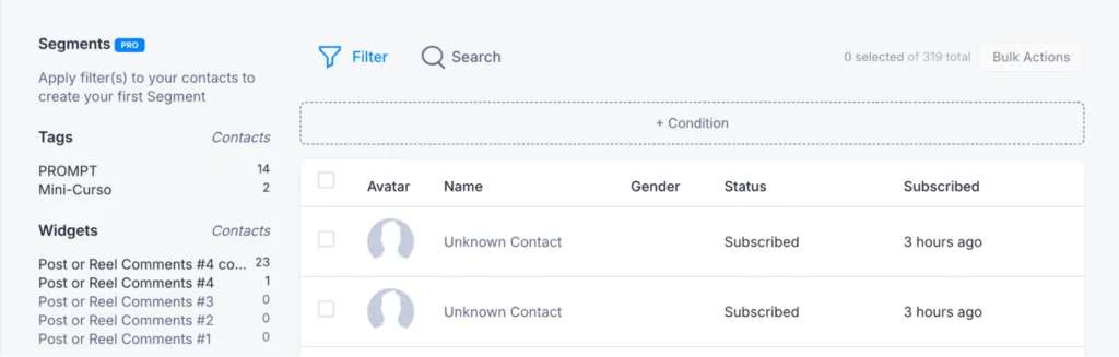 ☝️My tip: The cool thing about Manychat is that you can apply filters and tags and see which widgets perform best in conversions. You can also see where your contacts come from, which can help in future automation.